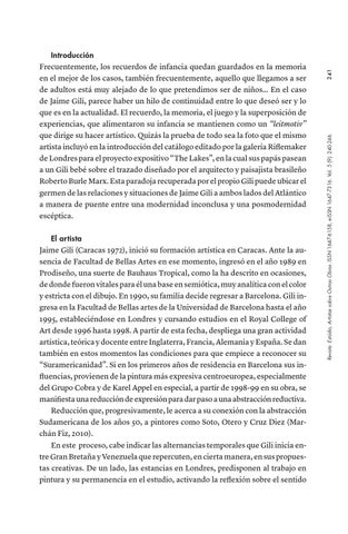 Introducción Frecuentemente, los recuerdos de infancia quedan guardados en la memoria en el mejor de los casos, también frecuentemente, aquello que llegamos a ser de adultos está muy alejado de lo que pretendimos ser de niños… En el caso de Jaime Gili, parece haber un hilo de continuidad entre lo que deseó ser y lo que es en la actualidad. El recuerdo, la memoria, el juego y la superposición de experiencias, que alimentaron su infancia se mantienen como un “leitmotiv” que dirige su hacer artístico. Quizás la prueba de todo sea la foto que el mismo artista incluyó en la introducción del catálogo editado por la galería Riflemaker de Londres para el proyecto expositivo “The Lakes”, en la cual sus papás pasean a un Gili bebé sobre el trazado diseñado por el arquitecto y paisajista brasileño Roberto Burle Marx. Esta paradoja recuperada por el propio Gili puede ubicar el germen de las relaciones y situaciones de Jaime Gili a ambos lados del Atlántico a manera de puente entre una modernidad inconclusa y una posmodernidad escéptica.