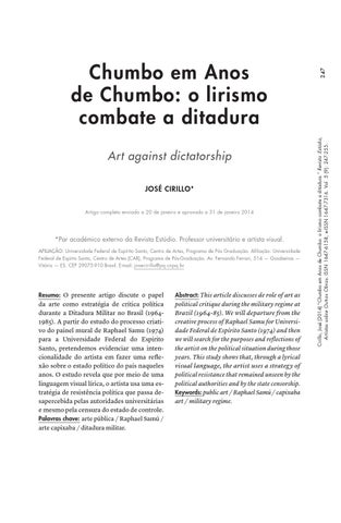 247 Cirillo, José (2014) “Chumbo em Anos de Chumbo: o lirismo combate a ditadura.” Revista :Estúdio, Artistas sobre Outras Obras. ISSN 1647-6158, e-ISSN 1647-7316. Vol. 5 (9): 247-255.