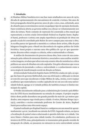 1. Introdução A Ditadura Militar brasileira teve sua fase mais retalhadora nos anos de 1970, década de aprimoramento dos mecanismos de controle e tortura. São anos de forte propaganda oficial do governo; anos de pão e circo, mas, sobretudo, anos de chumbo para os movimentos sociais ou qualquer tipo de oposição declarada. Fazer resistência aberta ao governo militar era colocar-se voluntariamente nos sítios da tortura. Neste contexto de repressão foi construída a obra mural que representaria a recém-criada Universidade Federal no Espírito Santo. Raphael Samú, professor e artista com ampla experiência na produção de obras em grande escala foi convidado pelo Reitor do novo campus para executar a obra. A escolha parece ter ignorado a memória e a cultura deste artista, filho de pais húngaros foragidos para o Brasil em decorrência do regime político da União Soviética. Samú projeta e executa uma obra pública de 140 m2 que aparentemente discorre sobre a utopia e a ciência, sobre a universidade e o futuro. A análise de documentos do processo dessa obra, bem como de sua contaminação pela cultura do momento histórico, associados a uma análise semiótica das imagens, revelam que talvez esta seja a maior obra de resistência e crítica políticas aos anos de ditadura em solo capixaba. Um grito silencioso que evoca a resistência da juventude e coloca a universidade e o conhecimento como a nova utopia de transformação social em direção ao futuro. A Universidade Federal do Espírito Santo (UFES) foi criada em 1961, no apagar das luzes do governo Kubitschek, mas sua efetivação e edificação se deram ao som dos anos que sucederam o Golpe Militar de 1964. Assim, o novo espaço acadêmico que materializava o sonho capixaba de ter em seu solo uma universidade federal, agrega-se à vontade política de também avançar os limites municipais da capital. O Prédio inicialmente utilizado para a Administração Central e pela Biblioteca da UFES ficava imediatamente na entrada do campus. O projeto arquitetônico deste prédio desenhava um grande paredão de mais de 140 metros quadrados, uma empena cega virada para a cidade. O reitor, Máximo Borgo (19711975), convidou o recém-contratado professor do Centro de Artes, Raphael Samú para realizar uma obra neste espaço. O painel realizado por Raphael Samú se configurou em um mural de aproximadamente 140 m2, localizado na entrada da UFES. Segundo relatos, na época a localização do painel estava relacionada à questão dela dar-se à cidade. Um novo futuro e limites para uma cidade insular. Os estudantes, professores ou técnicos da UFES, mas, principalmente os transeuntes pela grande avenida de integração da cidade, ao passarem ou entrarem na nova universidade seriam