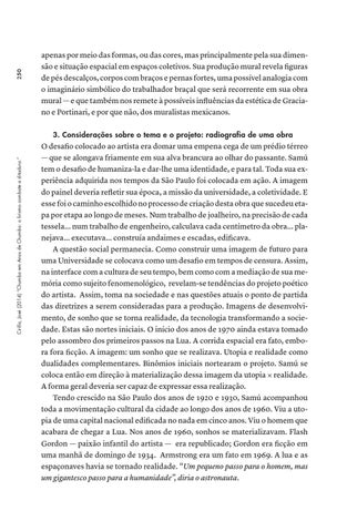 apenas por meio das formas, ou das cores, mas principalmente pela sua dimensão e situação espacial em espaços coletivos. Sua produção mural revela figuras de pés descalços, corpos com braços e pernas fortes, uma possível analogia com o imaginário simbólico do trabalhador braçal que será recorrente em sua obra mural — e que também nos remete à possíveis influências da estética de Graciano e Portinari, e por que não, dos muralistas mexicanos. 3. Considerações sobre o tema e o projeto: radiografia de uma obra O desafio colocado ao artista era domar uma empena cega de um prédio térreo — que se alongava friamente em sua alva brancura ao olhar do passante. Samú tem o desafio de humaniza-la e dar-lhe uma identidade, e para tal. Toda sua experiência adquirida nos tempos da São Paulo foi colocada em ação. A imagem do painel deveria refletir sua época, a missão da universidade, a coletividade. E esse foi o caminho escolhido no processo de criação desta obra que sucedeu etapa por etapa ao longo de meses. Num trabalho de joalheiro, na precisão de cada tessela... num trabalho de engenheiro, calculava cada centímetro da obra... planejava... executava... construía andaimes e escadas, edificava. A questão social permanecia. Como construir uma imagem de futuro para uma Universidade se colocava como um desafio em tempos de censura. Assim, na interface com a cultura de seu tempo, bem como com a mediação de sua memória como sujeito fenomenológico, revelam-se tendências do projeto poético do artista. Assim, toma na sociedade e nas questões atuais o ponto de partida das diretrizes a serem consideradas para a produção. Imagens de desenvolvimento, de sonho que se torna realidade, da tecnologia transformando a sociedade. Estas são nortes iniciais. O início dos anos de 1970 ainda estava tomado pelo assombro dos primeiros passos na Lua. A corrida espacial era fato, embora fora ficção. A imagem: um sonho que se realizava. Utopia e realidade como dualidades complementares. Binômios iniciais nortearam o projeto. Samú se coloca então em direção à materialização dessa imagem da utopia × realidade. A forma geral deveria ser capaz de expressar essa realização. Tendo crescido na São Paulo dos anos de 1920 e 1930, Samú acompanhou toda a movimentação cultural da cidade ao longo dos anos de 1960. Viu a utopia de uma capital nacional edificada no nada em cinco anos. Viu o homem que acabara de chegar a Lua. Nos anos de 1960, sonhos se materializavam. Flash Gordon — paixão infantil do artista — era republicado; Gordon era ficção em uma manhã de domingo de 1934. Armstrong era um fato em 1969. A lua e as espaçonaves havia se tornado realidade. “Um pequeno passo para o homem, mas um gigantesco passo para a humanidade”, diria o astronauta.