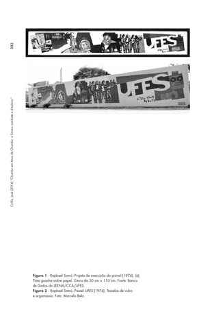 Figura 1 ∙ Raphael Samú. Projeto de execução do painel (1974). (a) Tinta guache sobre papel. Cerca de 30 cm × 110 cm. Fonte: Banco de Dados do LEENA/CCA/UFES. Figura 2 ∙ Raphael Samú. Painel UFES (1974). Tesselas de vidro e argamassa. Foto: Marcela Belo.