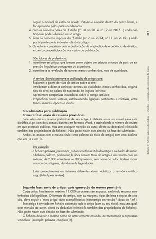 São fatores de preferência: 1. Incentivam-se artigos que tomam como objeto um criador oriundo de país de expressão linguística portuguesa ou espanhola. 2. Incentiva-se a revelação de autores menos conhecidos, mas de qualidade. A revista :Estúdio promove a publicação de artigos que: · Explorem o ponto de vista do artista sobre a arte; · Introduzam e deem a conhecer autores de qualidade, menos conhecidos, originários do arco de países de expressão de línguas ibéricas; · Apresentem perspetivas inovadoras sobre o campo artístico; · Proponham novas sínteses, estabelecendo ligações pertinentes e criativas, entre temas, autores, épocas e ideias. Procedimentos para publicação Primeira fase: envio de resumos provisórios Para submeter um resumo preliminar do seu artigo à :Estúdio envie um e-mail para estudio@fba.ul.pt, com dois anexos distintos em formato Word, e assinalando o número da revista em que pretende publicar, mas sem qualquer menção ao autor, direta ou deduzível (eliminá-la também das propriedades do ficheiro). Não pode haver auto-citação na fase de submissão. Ambos os anexos têm o mesmo título (uma palavra do título do artigo) com uma declinação em _a e em _b. Por exemplo: · o ficheiro palavra_preliminar_a.docx contém o título do artigo e os dados do autor. · o ficheiro palavra_preliminar_b.docx contém título do artigo e um resumo com um máximo de 2.000 caracteres ou 300 palavras, sem nome do autor. Poderá incluir uma ou duas figuras, devidamente legendadas. Estes procedimentos em ficheiros diferentes visam viabilizar a revisão científica cega (blind peer review). Segunda fase: envio de artigos após aprovação do resumo provisório Cada artigo final tem um máximo 11.000 caracteres sem espaços, excluindo resumos e referências bibliográficas. O formato do artigo, com as margens, tipos de letra e regras de citação, deve seguir o ‘meta-artigo’ auto exemplificativo (meta-artigo em versão *.docx ou *.rtf ). Este artigo é enviado em ficheiro contendo todo o artigo (com ou seu título), mas sem qualquer menção ao autor, direta ou deduzível (eliminá-la também das propriedades do ficheiro). Não pode haver auto-citação na fase de submissão. O ficheiro deve ter o mesmo nome do anteriormente enviado, acrescentando a expressão ‘completo’ (exemplo: palavra_completo_b).