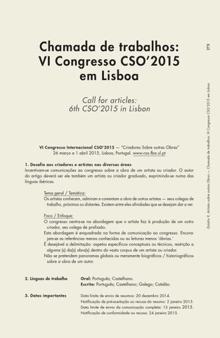 273 :Estúdio 9, Artistas sobre outras Obras — Chamada de trabalhos: VI Congresso CSO’2015 em Lisboa