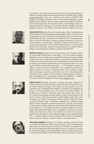 Cleomar Rocha (Brasil). Doutor em Comunicação e Cultura Contemporâneas (UFBA), Mestre em Arte e Tecnologia da Imagem (UnB). Professor do Programa de Pós-graduação em Arte e Cultura Visual da Faculdade de Artes Visuais da Universidade Federal de Goiás. Coordenador do Media Lab UFG. Artista-pesquisador. Atua nas áreas de arte, design, produtos e processos inovadores, com foco em mídias interativas, incluindo games, interfaces e sistemas computacionais. É supervisor de pós-doutorado na Universidade Federal de Goiás e na Universidade Federal do Rio de Janeiro. Estudos de pós-doutoramentos em Estudos Culturais (UFRJ), e em Tecnologias da Inteligência e Design Digital (PUC-SP). Francisco Paiva (Portugal). Francisco Tiago Antunes Paiva, Professor Auxiliar da Universidade da Beira Interior, onde dirige o 1º Ciclo de estudos em Design Multimédia. Doutor em Belas Artes, especialidade de Desenho, pela Faculdade de Belas Artes da Universidade do País Basco, licenciado em Arquitectura pela Faculdade de Ciências e Tecnologia da Universidade de Coimbra e licenciado em Design pela Faculdade de Belas-Artes da Universidade de Lisboa. Foi investigador-visitante na Universidade de Bordéus — 3. É Investigador integrado do LabCom na linha de Cinema e Multimédia. O seu interesse principal de investigação centra-se nos processos espacio-temporais. Autor de diversos artigos sobre arte, design, arquitectura e património e dos livros O Que Representa o Desenho? Conceito, objectos e fins do desenho moderno (2005) e Auditórios: Tipo e Morfologia (2011). Coordenador Científico da DESIGNA — Conferência Internacional de Investigação em Design (www.designa.ubi.pt). Heitor Alvelos (Portugal). Doutorado em Design pelo Royal College of Art (2003) e Mestre em Comunicação Visual pela School of the Art Institute of Chicago (1992). Professor de Design e Novos Media na Universidade do Porto, tem contribuído para a implementação estratégica da Disciplina de Investigação em Design no contexto português, quer como membro do Conselho Científico da Fundação para a Ciência e Tecnologia, quer como Director, pela U.Porto, do ID+, Instituto de Investigação em Design, Media e Cultura. Desenvolve I&D no âmbito do Programa UTAustin-Portugal para os Media Digitais desde 2006, sendo atualmente o seu Director Nacional para Outreach. Ainda no âmbito do Programa UTAustin-Portugal, dirige o FuturePlaces, medialab para a cidadania, desde 2008. É membro de diversos Conselhos internacionais, incluindo o Executive Board da European Academy of Design e o Advisory Board for Digital Communities do Ars Electronica, e o Conselho Consultivo do programa Manobras no Porto. Desde 2000, desenvolve trabalho sonoro, cenográfico e de design com diversas editoras: Ash International, Touch, Cronica Electronica e Tapeworm. Comissaria desde 2002 o laboratório de crítica cultural Autodigest, canta na Stopestra desde 2011 e co-dirige a editora de música aleatória 3-33.me. Áreas de investigação incluem media participativos, cidadania criativa e criminologia cultural. João Paulo Queiroz (Portugal). Curso Superior de Pintura pela Escola Superior de Belas-Artes de Lisboa. Mestre em Comunicação, Cultura, e Tecnologias de Informação pelo Instituto Superior de Ciências do Trabalho e da Empresa (ISCTE). Doutor em Belas-Artes pela Universidade de Lisboa. É professor na Faculdade de Belas-Artes desta Universidade (FBAUL), responsável pelo doutoramento na área de especialidade em Arte Multimédia e leciona nos diversos cursos de