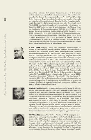 Licenciatura, Mestrado e Doutoramento. Professor nos cursos de doutoramento em Ensino da Universidade do Porto e de doutoramento em Artes da Universidade de Sevilha. Co autor dos programas de Desenho A e B (10º ao 12º anos) do Ensino Secundário. Dirigiu formação de formadores e outras ações de formação em educação artística creditadas pelo Conselho Científico-Pedagógico da Formação Contínua. Livro Cativar pela imagem, 5 textos sobre Comunicação Visual FBAUL, 2002. Investigador integrado no Centro de Estudos e Investigação em Belas-Artes (CIEBA), ativo nas áreas de Teoria da Imagem e de Educação Artística. Coordenador do Congresso Internacional CSO (2010, 2011, 2012, 2013) e diretor das revistas académicas :Estúdio, ISSN 1647-6158, Gama ISSN 21828539, e Croma ISSN 2182-8547. Coordenador do Congresso Matéria-Prima, Práticas das Artes Visuais no Ensino Básico e Secundário (2012, 2013). Dirige a Revista Matéria-Prima, ISSN 2182-9756. Membro de diversas comissões e painéis científicos, de avaliação, e conselhos editoriais. Subdiretor da FBAUL. Diversas exposições individuais de pintura. Prémio de Pintura Gustavo Cordeiro Ramos pela Academia Nacional de Belas-Artes em 2004. J. Paulo Serra (Portugal). J. Paulo Serra é Licenciado em Filosofia pela Faculdade de Letras de Lisboa e Mestre, Doutor e Agregado em Ciências da Comunicação pela Universidade da Beira Interior. Nesta Universidade, é Professor Associado no Departamento de Comunicação e Artes e investigador no Laboratório de Comunicação e Conteúdos On-line (LABCOM), integrando o Grupo de Investigação sobre Informação e Persuasão. Desempenha, atualmente, os cargos de Presidente da Faculdade de Artes e Letras e de Diretor do Doutoramento em Ciências da Comunicação. É autor dos livros A Informação como Utopia (1998), Informação e Sentido: O Estatuto Epistemológico da Informação (2003) e Manual de Teoria da Comunicação (2008), co autor do livro Informação e Persuasão na Web. Relatório de um Projecto (2009) e co organizador das obras Jornalismo Online (2003), Mundo Online da Vida e Cidadania (2003), Da comunicação da Fé à fé na Comunicação (2005), Ciências da Comunicação em Congresso na Covilhã (Actas, 2005), Retórica e Mediatização: Da Escrita à Internet (2008), Pragmática: Comunicação Publicitária e Marketing (2011) e Filosofias da Comunicação (2011). Tem ainda vários capítulos de livros e artigos publicados em obras coletivas e revistas. A sua investigação tem incidido, prioritariamente, nos processos de informação e persuasão relativos à comunicação mediática, com especial ênfase na que se refere à Internet. Joaquín Escuder (Espanha). Licenciado en Pintura por la Facultad de Bellas Artes de la Universidad de Barcelona (1979/1984). Doctorado en Bellas Artes por la Facultad de Bellas Artes de la Universidad Politécnica de Valencia (2001). Ha sido profesor en las siguientes universidades: Internacional de Catalunya y Murcia. En la actualidad lo es de la de Zaragoza. Ha sido becario, entre otras, de las siguientes instituciones: Generalitat de Catalunya, Casa de Velázquez, Grupo Endesa y Real Academia de España en Roma. Trabaja en cuestiones relacionadas con la visualidad y la representación en la pintura. Ha expuesto individualmente en las siguientes ciudades españolas: Madrid, Valencia, Zaragoza, Palma de Mallorca, Castellón y Cádiz. Ha participado en numerosas muestras colectivas, destacando en el exterior las realizadas en Utrecht, Venecia, París y Tokio. Su obra se encuentra representada en colecciones de instituciones públicas y privadas de España. Josu Rekalde (Espanha, Amorebieta — País Vasco, 1959) compagina la creación artística con la de profesor catedrático en la Facultad de Bellas Artes de La universidad del País Vasco. Su campo de trabajo es multidisciplinar aunque su faceta más conocida es la relacionada con el video y las nuevas tecnologías. Los temas que trabaja se desplazan desde el intimismo a la relación social, desde el Yo al Otro, desde lo metalingüístico a lo narrativo. Ha publicado numerosos artículos y libros entre los que destacamos: The Technological “Interface” in Contemporary Art en Innovation: Economic, Social and Cultural Aspects. University of Nevada,