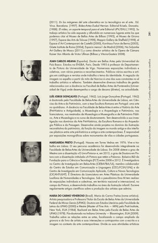 Juan Carlos Meana (Espanha). Doctor em Bellas Artes pela Universidad do País Basco. Estudos na ENSBA, Paris. Desde 1993 é professor do Departamento de Pintura da Universidade de Vigo. Numerosas exposições individuais e coletivas, com vários premios e reconhecimentos. Publicou vários escritos e artigos em catálogos e revistas onde trabalha o tema da identidade. A negação da imagem no espelho a partir do mito de Narciso é uma das suas constantes no el trabalho artístico e reflexivo. Também desenvolve diversos trabalhos de gestão relacionados con a docência na Facultad de Bellas Artes de Pontevedra (Universidad de Vigo) onde desempenha o cargo de decano (diretor), na actualidade. Luís Jorge Gonçalves (Portugal, 1962). Luís Jorge Gonçalves (Portugal, 1962) é doutorado pela Faculdade de Belas-Artes da Universidade de Lisboa, em Ciências da Arte e do Património, com a tese Escultura Romana em Portugal: uma arte no quotidiano. A docência na Faculdade de Belas-Artes é entre a História da Arte (Pré-História e Antiguidade), a Museologia e a Arqueologia e Património, nas licenciaturas, nos mestrados de Museologia e Museografia e de Património Público, Arte e Museologia e no curso de doutoramento. Tem desenvolvido a sua investigação nos domínios da Arte Pré-Histórica, da Escultura Romana e da Arqueologia Pública e da Paisagem. Desenvolve ainda projetos no domínio da ilustração reconstitutiva do património, da função da imagem no mundo antigo e dos interfaces plásticos entre arte pré-histórica e antiga e arte contemporânea. É responsável por exposições monográficas sobre monumentos de vilas e cidades portuguesas. Margarida Prieto (Portugal). Nasceu em Torres Vedras em 1976. Vive e trabalha em Lisboa. O seu percurso académico foi desenvolvido integralmente na Faculdade de Belas-Artes da Universidade de Lisboa. Em 2008 obteve o grau de Mestre com a dissertação «O Livro-Pintura» e, em 2013, o grau de Doutora em Pintura com a dissertação intitulada «A Pintura que retém a Palavra». Bolseira I&D da Fundação para a Ciência e Tecnologia (FCT) entre 2008 e 2012. É Investigadora no Centro de Investigação em Belas-Artes (CIEBA-FBA/UL), membro colaborador do Centro de Estudos em Comunicação e Linguagens (CECL-FCSH/UNL) e do Centro de Investigação em Comunicação Aplicada, Cultura e Novas Tecnologias (CICANT-ULHT). É Directora da Licenciatura em Artes Plásticas da Universidade Lusófona de Humanidades e Tecnologias. Sob o pseudónimo Ema M tem realizado exposições individuais e colectivas, em território nacional e internacional, no campo da Pintura, e desenvolvido trabalhos na área da ilustração infantil. Escreve regularmente artigos científicos sobre a produção dos artistas que admira. Maria do Carmo Veneroso (Brasil). Maria do Carmo Freitas (nome artístico). Artista pesquisadora e Professora Titular da Escola de Belas Artes da Universidade Federal de Minas Gerais (UFMG). Doutora em Estudos Literários pela Faculdade de Letras da UFMG (2000) e Mestre (Master of Fine Arts — MFA) pelo Pratt Institute, New York, EUA (1984). Bacharel em Belas Artes pela Escola de Belas Artes da UFMG (1978). Pós-doutorado na Indiana University — Bloomington, EUA (2009). Trabalha sobre as relações entre as artes, focalizando o campo ampliado da gravura e do livro de artista e suas interseções e contrapontos com a escrita e a imagem no contexto da arte contemporânea. Divide as suas atividades artísticas