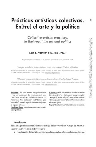 31 E. Pereyra, Julio & Lepra, Valeria (2014) “Prácticas artísticas colectivas. En[tre] el arte y la política.” Revista :Estúdio, Artistas sobre Outras Obras. ISSN 1647-6158, e-ISSN 1647-7316. Vol. 5 (9): 31-38.
