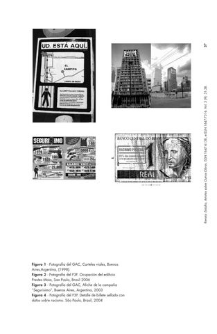 Figura 1 ∙ Fotografía del GAC, Carteles viales, Buenos Aires,Argentina, (1998). Figura 2 ∙ Fotografía del F3F. Ocupación del edificio Prestes Maia, Sao Paulo, Brasil 2006 Figura 3 ∙ Fotografía del GAC, Afiche de la campaña “Segurisimo”, Buenos Aires, Argentina, 2003 Figura 4 ∙ Fotografía del F3F. Detalle de billete sellado con datos sobre racismo. São Paulo, Brasil, 2004
