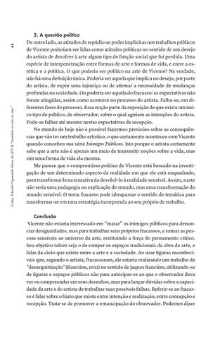 2. A questão política De outro lado, as atitudes de repúdio ao poder implícitas nos trabalhos públicos de Vicente poderiam ser lidas como atitudes políticas no sentido de um desejo do artista de devolver à arte algum tipo de função social que foi perdida. Uma espécie de interpenetração entre formas de arte e formas de vida, e entre a estética e a política. O que poderia ser político na arte de Vicente? Na verdade, não há uma definição única. Poderia ser aquela que implica no desejo, por parte do artista, de expor uma injustiça ou de afirmar a necessidade de mudanças profundas na sociedade. Ou poderia ser aquela do fracasso: as expectativas não foram atingidas, assim como acontece no processo do artista. Falha-se, em diferentes fases do processo. Essa noção parte da suposição de que exista um único tipo de público, de observador, sobre o qual agiriam as intenções do artista. Pode-se falhar até mesmo nestas expectativas de recepção. No mundo de hoje não é possível fazermos previsões sobre as consequências que vão ter um trabalho artístico, o que certamente aconteceu com Vicente quando concebeu sua série Inimigos Públicos. Isto porque o artista certamente sabe que a arte não é apenas um meio de transmitir noções sobre a vida, mas sim uma forma de vida ela mesma. Me parece que o compromisso político de Vicente está baseado na investigação de um determinado aspecto da realidade em que ele está enquadrado, para transformá-lo na tentativa da devolvê-lo à realidade sensível. Assim, a arte não seria uma pedagogia ou explicação do mundo, mas uma transformação do mundo sensível. O tema fracasso pode ultrapassar o sentido de temática para transformar-se em uma estratégia incorporada ao seu próprio de trabalho. Conclusão Vicente não estaria interessado em “matar” os inimigos públicos para denunciar desigualdades, mas para trabalhar seus próprios fracassos, e tornar as pessoas sensíveis ao universo da arte, restituindo a força do pensamento crítico. Seu objetivo talvez seja o de romper os espaços tradicionais da obra de arte, e falar da cisão que existe entre a arte e a sociedade. Ao usar figuras reconhecíveis que, segundo o artista, fracassaram, ele estaria realizando um trabalho de ”desarquirização”(Rancière, 2012) no sentido de Jaques Rancière, utilizando-se de figuras e espaços públicos não para antecipar-se ao que o observador deva ver ou compreender em seus desenhos, mas para lançar dúvidas sobre a capacidade da arte e do artista de trabalhar suas possíveis falhas. Referir-se ao fracasso é falar sobre o hiato que existe entre intenção e realização, entre concepção e recepção. Trata-se de promover a emancipação do observador. Podemos dizer