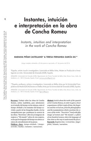 46 Piñar Castellano, Mariana & García Gil, Teresa Fernanda (2014) “Instantes, intuición e interpretación en la obra de Concha Romeu.” Revista :Estúdio, Artistas sobre Outras Obras. ISSN 1647-6158, e-ISSN 1647-7316. Vol. 5 (9): 46-51.
