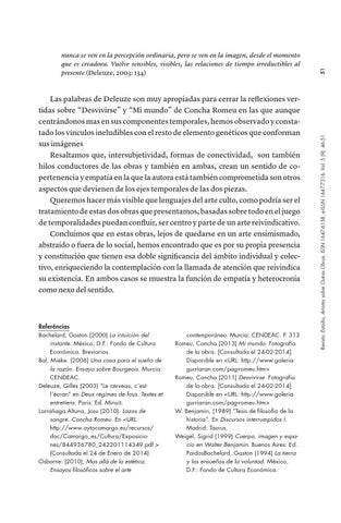 contemporáneo. Murcia: CENDEAC. P. 313 Romeu, Concha (2013) Mi mundo. Fotografía de la obra. [Consultada el 24-02-2014] Disponible en <URL: http://www.galeriagurriaran.com/pag-romeu.htm> Romeu, Concha (2011) Desvivirse. Fotografía de la obra. [Consultada el 24-02-2014] Disponible en <URL: http://www.galeriagurriaran.com/pag-romeu.htm> W. Benjamin, (1989) “Tesis de filosofía de la historia”. En Discursos interrumpidos I. Madrid: Taurus. Weigel, Sigrid (1999) Cuerpo, imagen y espacio en Walter Benjamin. Buenos Aires: Ed. PaidosBachelard, Gaston (1994) La tierra y los ensueños de la voluntad. México, D.F.: Fondo de Cultura Económica.