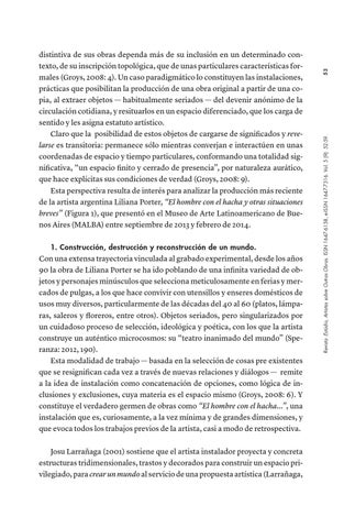 1. Construcción, destrucción y reconstrucción de un mundo. Con una extensa trayectoria vinculada al grabado experimental, desde los años 90 la obra de Liliana Porter se ha ido poblando de una infinita variedad de objetos y personajes minúsculos que selecciona meticulosamente en ferias y mercados de pulgas, a los que hace convivir con utensillos y enseres domésticos de usos muy diversos, particularmente de las décadas del 40 al 60 (platos, lámparas, saleros y floreros, entre otros). Objetos seriados, pero singularizados por un cuidadoso proceso de selección, ideológica y poética, con los que la artista construye un auténtico microcosmos: su “teatro inanimado del mundo” (Speranza: 2012, 190). Esta modalidad de trabajo — basada en la selección de cosas pre existentes que se resignifican cada vez a través de nuevas relaciones y diálogos — remite a la idea de instalación como concatenación de opciones, como lógica de inclusiones y exclusiones, cuya materia es el espacio mismo (Groys, 2008: 6). Y constituye el verdadero germen de obras como “El hombre con el hacha...”, una instalación que es, curiosamente, a la vez mínima y de grandes dimensiones, y que evoca todos los trabajos previos de la artista, casi a modo de retrospectiva. Josu Larrañaga (2001) sostiene que el artista instalador proyecta y concreta estructuras tridimensionales, trastos y decorados para construir un espacio privilegiado, para crear un mundo al servicio de una propuesta artística (Larrañaga,