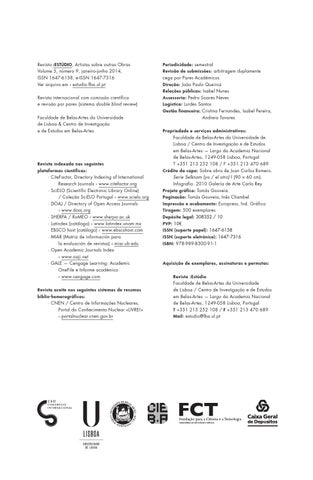 Periodicidade: semestral Revisão de submissões: arbitragem duplamente cega por Pares Académicos Direção: João Paulo Queiroz Relações públicas: Isabel Nunes Assessoria: Pedro Soares Neves Logística: Lurdes Santos Gestão financeira: Cristina Fernandes, Isabel Pereira, Andreia Tavares Propriedade e ser viços administrativos: Faculdade de Belas-Artes da Universidade de Lisboa / Centro de Investigação e de Estudos em Belas-Artes — Largo da Academia Nacional de Belas-Artes, 1249-058 Lisboa, Portugal T +351 213 252 108 / F +351 213 470 689 Crédito da capa: Sobre obra de Juan Carlos Romero. Serie Selknam (yo / el otro) I (90 × 60 cm). Infografía. 2010 Galería de Arte Carla Rey. Projeto gráfico: Tomás Gouveia Paginação: Tomás Gouveia, Inês Chambel Impressão e acabamento: Europress, Ind. Gráfica Tiragem: 500 exemplares Depósito legal: 308352 / 10 PVP: 10€ ISSN (suporte papel): 1647-6158 ISSN (suporte eletrónico): 1647-7316 ISBN: 978-989-8300-91-1