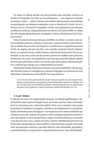 Cresci num período experimental de um país tão jovem quanto eu, onde sempre houve, aparte as opções politicas, uma grande e permeável liberdade cultural e até religiosa. Por isso acho que temos uma identidade bastante contaminada pelo que nos chega através dos portos e dos aeroportos, e agora via internet e satélite (Kia Henda, 2011: 17).