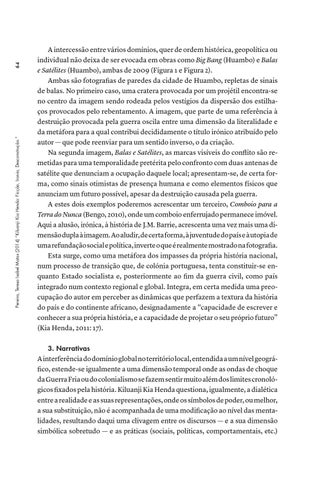 A intercessão entre vários domínios, quer de ordem histórica, geopolítica ou individual não deixa de ser evocada em obras como Big Bang (Huambo) e Balas e Satélites (Huambo), ambas de 2009 (Figura 1 e Figura 2). Ambas são fotografias de paredes da cidade de Huambo, repletas de sinais de balas. No primeiro caso, uma cratera provocada por um projétil encontra-se no centro da imagem sendo rodeada pelos vestígios da dispersão dos estilhaços provocados pelo rebentamento. A imagem, que parte de uma referência à destruição provocada pela guerra oscila entre uma dimensão da literalidade e da metáfora para a qual contribui decididamente o título irónico atribuído pelo autor — que pode reenviar para um sentido inverso, o da criação. Na segunda imagem, Balas e Satélites, as marcas visíveis do conflito são remetidas para uma temporalidade pretérita pelo confronto com duas antenas de satélite que denunciam a ocupação daquele local; apresentam-se, de certa forma, como sinais otimistas de presença humana e como elementos físicos que anunciam um futuro possível, apesar da destruição causada pela guerra. A estes dois exemplos poderemos acrescentar um terceiro, Comboio para a Terra do Nunca (Bengo, 2010), onde um comboio enferrujado permanece imóvel. Aqui a alusão, irónica, à história de J.M. Barrie, acrescenta uma vez mais uma dimensão dupla à imagem. Ao aludir, de certa forma, à juventude do país e à utopia de uma refundação social e política, inverte o que é realmente mostrado na fotografia. Esta surge, como uma metáfora dos impasses da própria história nacional, num processo de transição que, de colónia portuguesa, tenta constituir-se enquanto Estado socialista e, posteriormente ao fim da guerra civil, como país integrado num contexto regional e global. Integra, em certa medida uma preocupação do autor em perceber as dinâmicas que perfazem a textura da história do país e do continente africano, designadamente a “capacidade de escrever e conhecer a sua própria história, e a capacidade de projetar o seu próprio futuro” (Kia Henda, 2011: 17). 3. Narrativas A interferência do domínio global no território local, entendida a um nível geográfico, estende-se igualmente a uma dimensão temporal onde as ondas de choque da Guerra Fria ou do colonialismo se fazem sentir muito além dos limites cronológicos fixados pela história. Kiluanji Kia Henda questiona, igualmente, a dialética entre a realidade e as suas representações, onde os símbolos de poder, ou melhor, a sua substituição, não é acompanhada de uma modificação ao nível das mentalidades, resultando daqui uma clivagem entre os discursos — e a sua dimensão simbólica sobretudo — e as práticas (sociais, políticas, comportamentais, etc.)