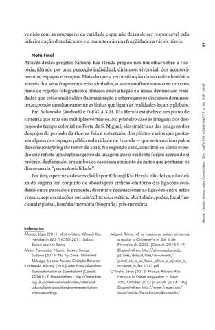 Nota Final Através destes projetos Kiluanji Kia Henda propõe-nos um olhar sobre a História, filtrado por uma perceção individual, diríamos, vivencial, dos acontecimentos, espaços e tempos. Mais do que a reconstituição da narrativa histórica através dos seus fragmentos e/ou símbolos, o autor confronta-nos com um conjunto de registos fotográficos e fílmicos onde a ficção e a ironia denunciam realidades que estão muito além da imaginação e interrogam os discursos dominantes, expondo simultaneamente as linhas que ligam as realidades locais e globais. Em Balumuka (Ambush) e O.R.G.A.S.M. Kia Henda estabelece um plano de simetria que atua em múltiplas vertentes. No primeiro caso as imagens dos despojos do tempo colonial no Forte de S. Miguel, são simétricas das imagens dos despojos do período da Guerra Fria e sobretudo, dos plintos vazios que pontuam alguns dos espaços públicos da cidade de Luanda — que se tornariam palco da série Redefining the Power de 2012. No segundo caso, constitui-se como espelho que reflete um duplo negativo da imagem que o ocidente forjou acerca de si próprio, desfazendo, em ambos os casos um conjunto de mitos que pontuam os discursos da “pós-colonialidade”. Por fim, o percurso desenvolvido por Kiluanji Kia Henda não deixa, não deixa de sugerir um conjunto de abordagens críticas em torno das ligações residuais entre passado e presente, discutir e reequacionar as ligações entre artes visuais, representações sociais/culturais, estética, identidade, poder, local/nacional e global, história/memória/biografia/ pós-memória.