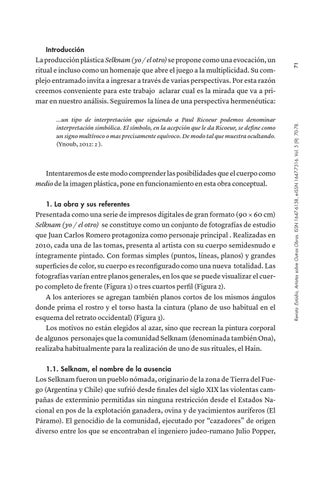 Introducción La producción plástica Selknam (yo / el otro) se propone como una evocación, un ritual e incluso como un homenaje que abre el juego a la multiplicidad. Su complejo entramado invita a ingresar a través de varias perspectivas. Por esta razón creemos conveniente para este trabajo aclarar cual es la mirada que va a primar en nuestro análisis. Seguiremos la línea de una perspectiva hermenéutica: