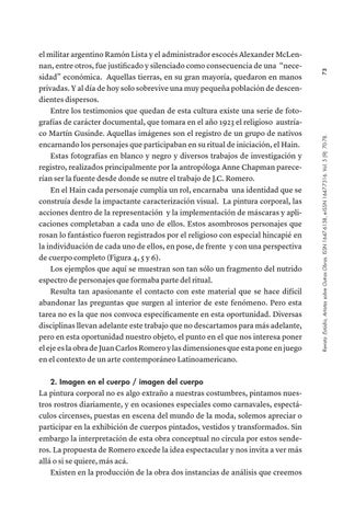 el militar argentino Ramón Lista y el administrador escocés Alexander McLennan, entre otros, fue justificado y silenciado como consecuencia de una “necesidad” económica. Aquellas tierras, en su gran mayoría, quedaron en manos privadas. Y al día de hoy solo sobrevive una muy pequeña población de descendientes dispersos. Entre los testimonios que quedan de esta cultura existe una serie de fotografías de carácter documental, que tomara en el año 1923 el religioso austríaco Martín Gusinde. Aquellas imágenes son el registro de un grupo de nativos encarnando los personajes que participaban en su ritual de iniciación, el Hain. Estas fotografías en blanco y negro y diversos trabajos de investigación y registro, realizados principalmente por la antropóloga Anne Chapman parecerían ser la fuente desde donde se nutre el trabajo de J.C. Romero. En el Hain cada personaje cumplía un rol, encarnaba una identidad que se construía desde la impactante caracterización visual. La pintura corporal, las acciones dentro de la representación y la implementación de máscaras y aplicaciones completaban a cada uno de ellos. Estos asombrosos personajes que rosan lo fantástico fueron registrados por el religioso con especial hincapié en la individuación de cada uno de ellos, en pose, de frente y con una perspectiva de cuerpo completo (Figura 4, 5 y 6). Los ejemplos que aquí se muestran son tan sólo un fragmento del nutrido espectro de personajes que formaba parte del ritual. Resulta tan apasionante el contacto con este material que se hace difícil abandonar las preguntas que surgen al interior de este fenómeno. Pero esta tarea no es la que nos convoca específicamente en esta oportunidad. Diversas disciplinas llevan adelante este trabajo que no descartamos para más adelante, pero en esta oportunidad nuestro objeto, el punto en el que nos interesa poner el eje es la obra de Juan Carlos Romero y las dimensiones que esta pone en juego en el contexto de un arte contemporáneo Latinoamericano.