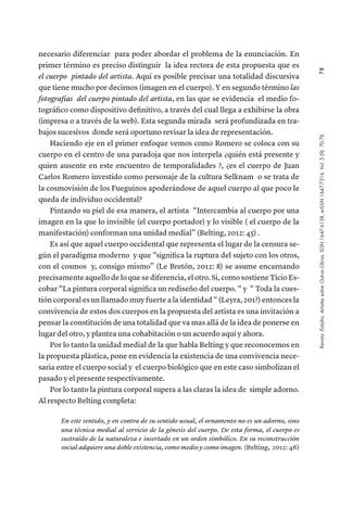 necesario diferenciar para poder abordar el problema de la enunciación. En primer término es preciso distinguir la idea rectora de esta propuesta que es el cuerpo pintado del artista. Aquí es posible precisar una totalidad discursiva que tiene mucho por decirnos (imagen en el cuerpo). Y en segundo término las fotografías del cuerpo pintado del artista, en las que se evidencia el medio fotográfico como dispositivo definitivo, a través del cual llega a exhibirse la obra (impresa o a través de la web). Esta segunda mirada será profundizada en trabajos sucesivos donde será oportuno revisar la idea de representación. Haciendo eje en el primer enfoque vemos como Romero se coloca con su cuerpo en el centro de una paradoja que nos interpela ¿quién está presente y quien ausente en este encuentro de temporalidades ?, ¿es el cuerpo de Juan Carlos Romero investido como personaje de la cultura Selknam o se trata de la cosmovisión de los Fueguinos apoderándose de aquel cuerpo al que poco le queda de individuo occidental? Pintando su piel de esa manera, el artista “Intercambia al cuerpo por una imagen en la que lo invisible (el cuerpo portador) y lo visible ( el cuerpo de la manifestación) conforman una unidad medial” (Belting, 2012: 45) . Es así que aquel cuerpo occidental que representa el lugar de la censura según el paradigma moderno y que “significa la ruptura del sujeto con los otros, con el cosmos y, consigo mismo” (Le Bretón, 2012: 8) se asume encarnando precisamente aquello de lo que se diferencia, el otro. Si, como sostiene Ticio Escobar “La pintura corporal significa un rediseño del cuerpo. “ y “ Toda la cuestión corporal es un llamado muy fuerte a la identidad “ (Leyra, 201?) entonces la convivencia de estos dos cuerpos en la propuesta del artista es una invitación a pensar la constitución de una totalidad que va mas allá de la idea de ponerse en lugar del otro, y plantea una cohabitación o un acuerdo aquí y ahora. Por lo tanto la unidad medial de la que habla Belting y que reconocemos en la propuesta plástica, pone en evidencia la existencia de una convivencia necesaria entre el cuerpo social y el cuerpo biológico que en este caso simbolizan el pasado y el presente respectivamente. Por lo tanto la pintura corporal supera a las claras la idea de simple adorno. Al respecto Belting completa: