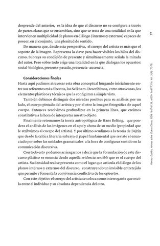 Consideraciones finales Hasta aquí pudimos atravesar esta obra conceptual hurgando inicialmente entre sus referentes más directos, los Selknam. Describimos, entre otras cosas, los elementos plásticos y técnicos que la configuran a simple vista. También debimos distinguir dos miradas posibles para su análisis: por un lado, el cuerpo pintado del artista y por el otro la imagen fotográfica de aquel cuerpo. Entonces resolvimos profundizar en la primera línea, que creímos constitutiva a la hora de interpretar nuestro objeto. Finalmente retomamos la teoría antropológica de Hans Belting, que pondera el análisis de las imágenes en el aquí y ahora de su medio (propiedad que le atribuimos al cuerpo del artista). Y por último acudimos a la teoría de Bajtín que desde la crítica literaria subraya el papel fundamental que reviste el enunciado por sobre las unidades gramaticales a la hora de configurar sentido en la comunicación discursiva. Con todo esto podemos arriesgarnos a decir que la formulación de este discurso plástico se enuncia desde aquella evidencia sensible que es el cuerpo del artista. Su densidad real se presenta como el lugar que articula el diálogo de los planos internos y externos del discurso, construyendo un invisible entretejido que permite y fomenta la convivencia conflictiva de los opuestos. Con este objetivo el cuerpo del artista se coloca como interrogante que oscila entre el individuo y su absoluta dependencia del otro.