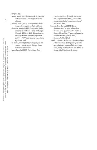 Referencias Bajtín, Mijaíl (2013) Estética de la creación verbal. Buenos Aires: Siglo Veintiuno editores. Belting, Hans (2012) Antropología de la imagen. Buenos Aires: Katz editores. Gusinde ,Martín (1923) Fotografías de los personajes del Hain. Tierra del Fuego. [Consult. 2014‑01-24] Disponible en: http://puesta-en- valor.blogspot.com. ar/2011/07/los-onas-en-el-impactantelegado-de.html Le Breton, David (2012) Antropología del cuerpo y modernidad. Buenos Aires: Nueva Visión editores. Leyra Begoña (201?) Entrevista a Ticio