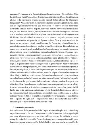 2. Presencia y ausencia Las variedades de la presencia de la Virgen María en las pinturas coloniales y especialmente de la Escuela Cusqueña son variedades enunciativas, que implican tanto a los autores como a los observadores, a través del estilo de la expresión y del estilo del contenido. Crean al mismo tiempo una predisposición para la comprensión e interpretación de la hibridez, que pasa por la aceptación del