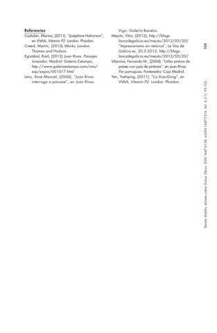 Referencias Cashdan, Marina, (2011). “Josephine Halvorson”, en VVAA, Vitamin P2. London: Phaidon. Creed, Martin, (2010).Works, London: Thames and Hudson. Egizábal, Raúl, (2012) Juan Rivas. Paisajes tuneados. Madrid: Galería Estampa, http://www.galeriaestampa.com/cms/ esp/expos/001017.html Lens, Xose Manuel, (2006). “Juan Rivas: interroga a paisaxe”, en Juan Rivas.