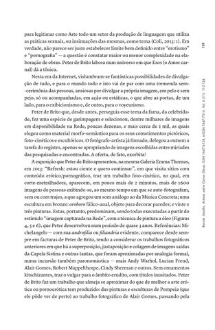 para legitimar como Arte todo um setor da produção de linguagem que utiliza as práticas sexuais, ou insinuações das mesmas, como tema (Coli, 2013: 1). Em verdade, não parece ser justo estabelecer limite bem definido entre “erotismo” e “pornografia” — a questão é constatar maior ou menor complexidade na elaboração de obras. Peter de Brito labora num universo em que Eros (o Amor carnal) dá a tônica. Nesta era da Internet, vislumbram-se fantásticas possibilidades de divulgação de tudo, e para o mundo todo e isto vai de par com uma tremenda sem-cerimônia das pessoas, ansiosas por divulgar a própria imagem, em pelo e sem pejo, só ou acompanhadas, em ação ou estáticas, o que abre as portas, de um lado, para o exibicionismo e, de outro, para o voyeurismo. Peter de Brito que, desde antes, perseguia esse tema da fama, da celebridade, fez uma espécie de garimpagem e selecionou, dentre milhares de imagens em disponibilidade na Rede, poucas dezenas, e mais cerca de 2 mil, as quais elegeu como material morfo-semântico para os seus cometimentos pictóricos, foto-cinéticos e escultóricos. O fotógrafo-artista já firmado, delegou a outrem a tarefa do registro, apenas se apropriando de imagens escolhidas entre miríades das pesquisadas e encontradas. A oferta, de fato, exorbita! A exposição que Peter de Brito apresentou, na mesma Galeria Emma Thomas, em 2013: “Refresh: estou ciente e quero continuar”, em que visita sítios com conteúdo erótico/pornográfico, traz um trabalho foto-cinético, no qual, em corte-metralhadora, aparecem, em pouco mais de 2 minutos, mais de 1600 imagens de pessoas exibindo-se, ao mesmo tempo em que se auto-fotografam, sem ou com trajes, a que agregou um som análogo ao da Música Concreta; uma escultura em bronze: oroboro fálico-anal, objeto para decorar paredes; e vinte e três pinturas. Estas, portanto, predominam, sendo todas executadas a partir do estímulo “imagem capturada na Rede”, com a técnica de pintura a óleo (Figuras 4, 5 e 6), que Peter desenvolveu num período de quase 3 anos. Referências: Michelangelo — com sua androfilia ou filiandria evidente, comparece desde sempre em facturas de Peter de Brito, tendo a considerar os trabalhos fotográficos anteriores em que há a superposição, justaposição e colagem de imagens saídas da Capela Sistina e outras tantas, que foram aproximadas por analogia formal, numa incursão também paronomástica — mais Andy Warhol, Lucian Freud, Alair Gomes, Robert Mappelthorpe, Cindy Sherman e outros. Sem ornamentos kitschizantes, traz o vulgar para o âmbito erudito, com títulos inusitados. Peter de Brito faz um trabalho que almeja se aproximar do que de melhor a arte erótica ou pornoerótica tem produzido: das pinturas e esculturas de Pompeia (que ele pôde ver de perto) ao trabalho fotográfico de Alair Gomes, passando pela