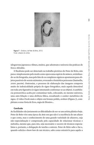 xilogravura japonesa e filmes, muitos, que adentram o universo das práticas de Eros e Afrodite. O Realismo pode ser detectado no trabalho pictórico de Peter de Brito, não pura e simplesmente pelo modo como opera uma espécie de mimese, avizinhando-se da fotografia, mas pelo fato de os complexos sígnicos apontarem para objetos passíveis de serem existentes, evocando a Semiótica peirceana (Santaella, 2000: passim). Outrossim, o processo de elaboração das imagens comporta muito de indexicalidade própria do signo fotográfico, mais aquela detectável em toda arte figurativa (o signo intentando conformar-se ao objeto). A ambiência pornoerótica acaba por contaminar tudo, colocando, no mesmo universo, uma auto-felação e uma abóbora fálica, ressaltando o caráter metafórico do signo. O vídeo Fresh mais o objeto em bronze polido, oroboro (Figura 7), completam a cena: festa de Eros, orgia de Dioniso… Conclusão As facilidades são justamente as dificuldades de ser-se um artista plástico hoje. Peter de Brito vive uma época da Arte em que não é a excelência de um afazer o que conta, mas o conhecimento de uma grande variedade de afazeres, cuja não-especialização é compensada pela capacidade de relacionar técnicas e métodos, mesmo que, para isto, seja necessário o socorro de técnicos-especialistas e, portanto, a delegação de tarefas a outrem. Peter de Brito sabe e faz e, quando solicita o know how de um técnico, sabe como orientá-lo para aquilo a