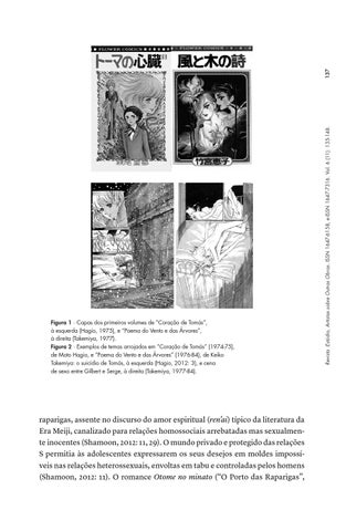 Figura 1 ∙ Capas dos primeiros volumes de “Coração de Tomás”, à esquerda (Hagio, 1975), e “Poema do Vento e das Árvores”, à direita (Takemiya, 1977). Figura 2 ∙ Exemplos de temas arrojados em “Coração de Tomás” (1974-75), de Moto Hagio, e “Poema do Vento e das Árvores” (1976-84), de Keiko Takemiya: o suicídio de Tomás, à esquerda (Hagio, 2012: 3), e cena de sexo entre Gilbert e Serge, à direita (Takemiya, 1977-84).