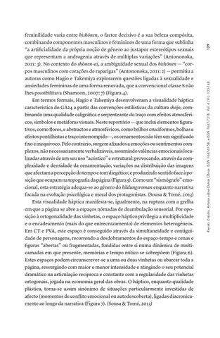 feminilidade varia entre bishōnen, o factor decisivo é a sua beleza compósita, combinando componentes masculinos e femininos de uma forma que sublinha “a artificialidade da própria noção de género ao justapor estereótipos sexuais que representam a androgenia através de múltiplas variações” (Antononoka, 2011: 3). No contexto do shōnen-ai, a ambiguidade sexual dos bishōnen — “corpos masculinos com corações de raparigas” (Antononoka, 2011: 2) — permitiu a autoras como Hagio e Takemiya explorarem questões ligadas à sexualidade e ansiedades femininas de uma forma renovada, que a convencional classe S não lhes possibilitava (Shamoon, 2007: 7) (Figura 4). Em termos formais, Hagio e Takemiya desenvolveram a visualidade háptica característica do GA24 a partir das convenções estilísticas da cultura shōjo, combinando uma qualidade caligráfica e serpenteante do traço com efeitos atmosféricos, símbolos e metáforas visuais. Neste reportório — que inclui elementos figurativos, como flores, e abstractos e atmosféricos, como brilhos cruciformes, bolhas e efeitos pontilhistas e traço interrompido —, os ornamentos não têm um significado fixo e inequívoco. Pelo contrário, surgem afixados a emoções ou sentimentos complexos, não necessariamente verbalizáveis, assumindo valências emocionais localizadas através de um seu uso “acústico” e estrutural: provocando, através da complexidade e densidade da ornamentação, variações na distribuição das imagens que afectam a percepção do tempo e tom diegético; e produzindo sentido face à posição que ocupam na topografia da página (Figura 5). Como um “sismógrafo” emocional, esta estratégia adequa-se ao género do bildungsroman enquanto narrativa focada na evolução psicológica e moral dos protagonistas. (Sousa & Tomé, 2013) Esta visualidade háptica manifesta-se, igualmente, na ruptura com a grelha em que a página se abre a espaços nómadas de deambulação sensorial. Por oposição à ortogonalidade das vinhetas, o espaço háptico privilegia a multiplicidade e o encadeamento (mais do que entrecruzamento) de elementos heterogéneos. Em CT e PVA, este espaço é conseguido através da simultaneidade e contiguidade de personagens, recorrendo a desdobramentos do espaço-tempo e cenas e figuras “abertas” ou fragmentadas, fundidas entre si numa dinâmica de multicamadas em que presente, memórias e tempo mítico se sobrepõem (Figura 6). Estes espaços podem circunscrever-se a uma ou duas vinhetas ou abarcar toda a página, ressurgindo com maior e menor intensidade e atingindo o seu potencial dramático na articulação recíproca e constante com a regularidade das vinhetas ortogonais, jogada na economia geral das obras. O háptico, enquanto qualidade plástica, torna-se assim sinónimo de situações particularmente investidas de afecto (momentos de conflito emocional ou autodescoberta), ligadas diacronicamente ao longo da narrativa (Figura 7). (Sousa & Tomé, 2013)