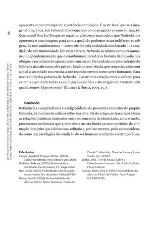 Conclusão Referências a esquizofrenia e a religiosidade são presentes em textos do próprio Nebreda, bem como de críticos sobre sua obra. Neste artigo, ao trazermos à tona as relações históricas existentes entre os conceitos de identidade, alma e razão, procuramos evidenciar que a obra deste artista funda-se num território de afirmação do sujeito que é doloroso e solitário e, por isso mesmo, pode ser considerada como um paradigma da condição do ser humano no mundo contemporâneo.