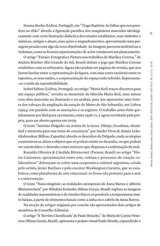 Susana Rocha (Lisboa, Portugal), em “Tiago Baptista: As falhas que nos prendem ao chão” aborda a figuração paródica dos imaginários marcados ideologicamente com certa ilustração didáctica dos estados totalitários, seus símbolos e mímicas, antigos e atuais, suas ações e enquadramentos, apresentando uma paisagem pesada com algo da nova objetividade. As imagens parecem inofensivas e violentas, como se fossem representações de actos criminosos em planeamento. O artigo “Ensaio: Fotografia e Pintura nos trabalhos de Marilice Corona,” de Andréa Brächer (Rio Grande do Sul, Brasil) debate o jogo que Marilice Corona estabelece com os referentes. Agora eles podem ser páginas de revista, que nos fazem hesitar entre a representação da figura, com suas cores variáveis entre os suportes, os seus ruídos, e a representação do espaço nela referido. Representa-se o ruído da reprodutibilidade. Isabel Sabino (Lisboa, Portugal), no artigo “Maria Keil: traços discretos para um espaço público,” revisita as memórias da falecida Maria Keil, uma autora com obra marcante na ilustração e no azulejo, para nos apresentar uma leitura dos esboços da ampliação da estação de Metro de São Sebastião, em Lisboa (1994) em paralelo com as anotações e os registos. O trabalho antes feito gratuitamente por Keil para 19 estações, entre 1958-72, é agora revisitado pela própria, para ser aberto apenas em 2009. O texto “António Delgado: un artista de la tierra. Dibujo, Escultura, identidad y memoria para una toma de conciencia” por Isusko Vivas & Amaia Lekerikabeaskoa (Bilbao, Espanha) aborda os desenhos de Delgado, onde as utopias construtivas se aliam a objetos que só podem existir no desenho, ou que podem ser construídos: o desenho como universo que dispensa a confirmação do real. Ronaldo Oliveira & Cândida Bittencourt (Paraná, Brasil) no artigo “Eloísa Cartonera: aproximações entre arte, cultura e processos de criação colaborativos” debruçam-se sobre uma cooperativa cultural argentina, criada pelo artista Javier Barilaro e pelo escritor Washington Cucurto, que se estabelece como plataforma de arte relacional: os livros são pretexto para a arte e a intervenção. O texto “Nanocriogênio: as realidades atemporais de Anna Barros e Alberto Blumenschein” por Nikoleta Kerinska (Minas Gerais, Brasil) explora as imagens de realidades nanométricas e de estados físicos só possíveis a temperaturas muito baixas, a partir de elementos banais como a unha ou o cabelo de Anna Barros. Na secção de artigos originais por convite são apresentados dois artigos de membros do Conselho Editorial. O artigo “A ‘Revista Classificada’ de Paulo Bruscky,” de Maria do Carmo Veneroso (Minas Gerais, Brasil), apresenta o projeto visual Paulo Brusky, expandindo a