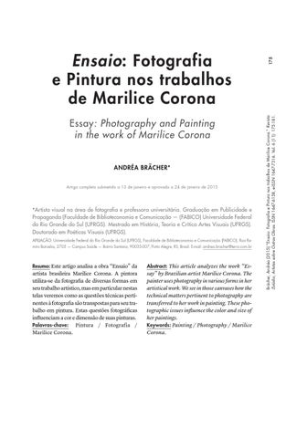 175 Brächer, Andréa (2015) “Ensaio: Fotografia e Pintura nos trabalhos de Marilice Corona.” Revista :Estúdio, Artistas sobre Outras Obras. ISSN 1647-6158, e-ISSN 1647-7316. Vol. 6 (11): 175-181.