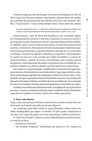 Genericamente, a obra de Maria Keil identifica-se por vocabulário figurativo, frequentemente narrativo e ilustrativo, expressivo do universo pessoal e preocupações sociais e humanistas; há uma “quase permanente ironia carinhosa” (Ribeiro, 1996: s/n) de sentido ora mais crítico, ora mais ameno (porventura nacional, ou feminino), formalmente devedor da depuração modernista: figuras de traços geometrizados, anatomia classicista, manchas de cor contornadas e niveladas, contenção da sugestão volumétrica na superfície. É principalmente a partir dos anos 50 e com o azulejo que melhor exemplifica o contexto de transição estética e a gestão de tensões contraditórias, tanto no plano pessoal (de género) e mais largamente ideológico (conciliação entre sensibilidade e experiência subjetivas e a difícil realidade social de então) como a nível formal. Isso verifica-se na geometrização, simplificação e nivelamento do registo progressivamente abstratizante dos ícones humanísticos. Logo surge, também, a repetição e padronização sugeridas pelo azulejo para soluções de maior escala, e a simplicidade das figuras geométricas básicas desdobradas associa-se à persistência da figuração. Sob exigente diálogo com Keil do Amaral na colaboração até ao princípio dos anos 70, há também situações puramente geométricas, formalistas na origem. Contudo, nessa linha mais abstracta persiste a transfiguração que já Mondrian em 1919-20 associa ao binómio realidade natural-realidade abstrata (Mondrian, 1995), de novo implícito na forma e espírito dos estudos aqui eleitos. 2. Traços redescobertos Surge, assim, uma pasta de cartolina couché branca, comum em lojas diversas, de formato A4, fechada com molas de pressão (Figura 1). Na contracapa, uma folha colada de papel alaranjado colado mostra um índice dactilografado que sugere o conteúdo. No lado oposto, compactam-se um bloco A5 e maços de papel com notas separadoras e plásticos protetores. O “Índice de desenhos” anuncia 16 itens inidentificáveis no interior da pasta, onde há, de facto: — Um bloco A5 “Castelo”; — Um envelope designado “Distribuição dos painéis A e B”. Contém no