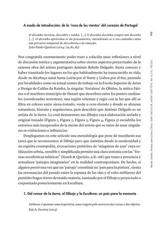 Nos congratula enormemente poder traer a colación unas reflexiones a nivel de discusión teórica y argumentativa sobre ciertos aspectos proyectuales de la extensa obra del artista portugués António Rebelo Delgado. Basta conocer y haber transitado los lugares en los que habitualmente ha transcurrido su vida; desde su Alcobaça natal hasta Leiria por el Norte y Lisboa por el Sur, pasando por localidades como su actual centro de trabajo en la Escola Superior de Artes e Design de Caldas da Rainha, la singular ‘fortaleza’ de Óbidos, la mítica Fátima o el marítimo municipio de Nazaré que describen entre los puntos cardinales (coordenadas terrestres), una región solemne y regia con la luz que allí se filtra en colores entre siena-tostado, verde u ocre-dorado y donde se abrazan naturaleza, historia y arquitectura, para descubrir que António Delgado es un artista de la tierra. Lo cual demuestran sus dibujos cuya elaboración seriada y original trazado (Figura 1, Figura 2, Figura 3, Figura 4, Figura 5) escudriña los entornos más inesperados de la mente del artista que se nutre de unas singulares re-visitaciones e influencias. Desplegamos en este artículo una metodología que pone de manifiesto esa tarea que le reconocemos al Dibujo pero que sintetiza desde la modernidad y un espíritu cosmopolita, evocaciones pretéritas de ‘máquinas de arar’ cuya estilización sobria, sensible y simplificada permite una clara sintonía con las “formas escultóricas telúricas” (Synek & Queirós, s/d.: 66) que traen a presencia y actualizan ‘paisajes imaginarios’ en la realidad contemporánea. De hecho, si alguien pensó una vez que un ‘paisaje’ constituía un ‘país para la pintura’, sienta las resonancias del pasado entre la espuma de las olas y el vaho neblinoso del pretérito fragor térreo devenido materia, tamizado por el Dibujo y proyectado o corporizado posteriormente en Escultura. 1. Del rumor de la tierra, el Dibujo y la Escultura: un país para la memoria Delinear é apontar uma trajetória, uma viagem pelo universo das coisas e dos objetos. Rui A. Pereira (2015)