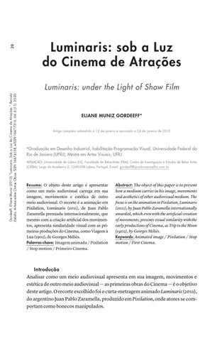 Introdução Analisar como um meio audiovisual apresenta em sua imagem, movimentos e estética de outro meio audiovisual — as primeiras obras do Cinema — é o objetivo deste artigo. O recorte escolhido foi o curta-metragem animado Luminaris (2011), do argentino Juan Pablo Zaramella, produzido em Pixilation, onde atores se comportam como bonecos manipulados.