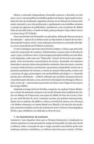 Diretor e animador independente, Zaramella começou a desenhar aos três anos, e aos 17 anos já publicava trabalhos gráficos de humor. Ingressando no Instituto de Cine de Avellaneda, Argentina, formou-se em Direção de Cinema Animado, iniciando a sua vida profissional, e rapidamente seus trabalhos atraíram a atenção de agências de publicidade e produtoras, com os prêmios de Melhor Filme do Ano (INCAA) e o Cóndor de Plata, pelas produções Viaje a Marte (2001) e A Luva (2004) (TV Cidade). Uma característica de Zaramella é ser pluralista, utilizando diversas técnicas de animação — apesar de se dedicar mais ao Stop motion. E depois de um desenho animado (Lapsus, 2007), e uma animação com bonecos e massinha (Na Ópera, 2010), ele produziu um Pixilation, Luminaris. O curta-metragem apresenta uma história simples e cômica, que pela indicação da composição de cenários e indumentária, se passa entre as décadas de 1940 e 1950, em Buenos Aires. O personagem principal trabalha em uma fábrica de lâmpadas, onde estas são “fabricadas” através da boca dos seus empregados. Com movimentos característicos da técnica, Zaramella cria situações inusitadas e surreais, típicas das produções animadas. Mas tais cenas, e mesmo a criação artificial desses movimentos, apresentam similaridade visual com as primeiras produções do Cinema, o cinema de atrações (Mascarello, 2006), com a presença de gags, personagens sem profundidade psicológica e a chamada parada para substituição — artifício utilizado para produzir desaparecimentos e transformações durante a cena, através da interrupção das filmagens (Mascarello, 2006: 29) — características presentes em obras como Viagem à Lua (1902), de Georges Méliès. Inspirada no tango Lluvia de Estrellas, composto em 1948 por Osmar Maderna, o roteiro da animação começou a ser escrito durante uma residência de criação em Abbaye de Fontevraud, com apoio da DRAC de Pays de la Loire, França, em 2008 (Revista Ñ, 2012). Luminaris recebeu 300 prêmios internacionais, dentre eles os prêmios de público e crítica, no Festival de Annecy 2011 (França); o de Melhor Animação, no Anima Mundi 2011 (Brasil), e foi uma das dez produções animadas incluídas na lista da Academia de Artes e Ciências Cinematográficas (EUA), o que a habilitou a ser indicada ao Oscar de 2012.
