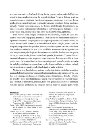 se aproximam das reflexões de Paulo Freire quanto à dimensão dialógica da construção do conhecimento e de seu sujeito. Para Freire, o diálogo se dá no encontro entre as pessoas e é deste encontro, que nascem os processos de um conhecimento construído em comunhão uns com os outros. Freire ainda nos adverte: “Como posso dialogar, se me fecho à contribuição dos outros que jamais reconheço, e até me sinto ofendido por ela? Como posso dialogar, se temo a superação e se, só em pensar nela sofro e definho? (Freire, 1987: 80). Essa postura com relação ao trabalho desenvolvido, diante do fazer arte com os catadores de papelão, em muito se distancia dos modos tradicionais de operar no campo da criação; distancia-se principalmente da ideia de artista fechado em seu ateliê. No modo mais tradicional, após a criação, a obra tradicional ganha as paredes das galerias, museus, entrando para o circuito tradicional dos modos de exibição de arte. Esta realidade nos remete às indagações que têm surgido a respeito do papel do artista na sociedade, desde o sentido que se dá ao processo de criação como também à apreciação artística. Trata-se de uma necessidade premente de se pensar estes processos de modo a avaliar até que ponto a arte de nossos dias tem demonstrado possuir um valor social. A noção de trabalho colaborativo e também a noção de comunidade se opõem radicalmente contra a perspectiva individualista de criação artística. Nesta margem da cidade, por meio da produção artística, a ação humana, isto é a capacidade de transformar o material bruto em cultura e arte, torna possível o contato com outras possibilidades de criação e revisão dos processos de vida — o “estar no mundo”. Essas possibilidades não dizem respeito somente a consumir aquilo que é produzido por outrem, mas sim, fazer com que as suas produções transitem. Aquelas que são produzidas na margem possam também circular pelo centro.