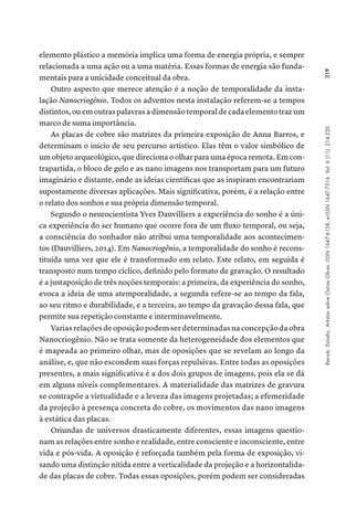 elemento plástico a memória implica uma forma de energia própria, e sempre relacionada a uma ação ou a uma matéria. Essas formas de energia são fundamentais para a unicidade conceitual da obra. Outro aspecto que merece atenção é a noção de temporalidade da instalação Nanocriogênio. Todos os adventos nesta instalação referem-se a tempos distintos, ou em outras palavras a dimensão temporal de cada elemento traz um marco de suma importância. As placas de cobre são matrizes da primeira exposição de Anna Barros, e determinam o início de seu percurso artístico. Elas têm o valor simbólico de um objeto arqueológico, que direciona o olhar para uma época remota. Em contrapartida, o bloco de gelo e as nano imagens nos transportam para um futuro imaginário e distante, onde as ideias científicas que as inspiram encontrariam supostamente diversas aplicações. Mais significativa, porém, é a relação entre o relato dos sonhos e sua própria dimensão temporal. Segundo o neurocientista Yves Dauvilliers a experiência do sonho é a única experiência do ser humano que ocorre fora de um fluxo temporal, ou seja, a consciência do sonhador não atribui uma temporalidade aos acontecimentos (Dauvilliers, 2014). Em Nanocriogênio, a temporalidade do sonho é reconstituída uma vez que ele é transformado em relato. Este relato, em seguida é transposto num tempo cíclico, definido pelo formato de gravação. O resultado é a justaposição de três noções temporais: a primeira, da experiência do sonho, evoca a ideia de uma atemporalidade, a segunda refere-se ao tempo da fala, ao seu ritmo e durabilidade, e a terceira, ao tempo da gravação dessa fala, que permite sua repetição constante e interminavelmente. Varias relações de oposição podem ser determinadas na concepção da obra Nanocriogênio. Não se trata somente da heterogeneidade dos elementos que é mapeada ao primeiro olhar, mas de oposições que se revelam ao longo da análise, e, que não escondem suas forças repulsivas. Entre todas as oposições presentes, a mais significativa é a dos dois grupos de imagens, pois ela se dá em alguns níveis complementares. A materialidade das matrizes de gravura se contrapõe a virtualidade e a leveza das imagens projetadas; a efemeridade da projeção à presença concreta do cobre, os movimentos das nano imagens à estática das placas. Oriundas de universos drasticamente diferentes, essas imagens questionam as relações entre sonho e realidade, entre consciente e inconsciente, entre vida e pós-vida. A oposição é reforçada também pela forma de exposição, visando uma distinção nítida entre a verticalidade da projeção e a horizontalidade das placas de cobre. Todas essas oposições, porém podem ser consideradas