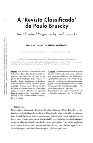 ta brasileiro Paulo Bruscky, focalizando sua Revista Classificada, que faz parte de um projeto desenvolvido pela dupla formada por Bruscky e Daniel Santiago, de publicação de anúncios classificados em jornais de grande circulação. Bruscky, através de seu trabalho, enfrentou a ditadura militar no Brasil (19641985), defendendo a liberdade de expressão. Palavras-chave: Revista Classificada / Paulo Bruscky / Arte contemporânea no Brasil / Livro de artista.