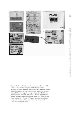 Figura 3 ∙ Paulo Bruscky a) Da série Aerogramas. Arte Correio, 1975, carimbo e nanquin sobre aerograma. 20,6x15,3 cm. Coleção do artista; b) Da série Telegrama. Arte Correio, 1976, telegrama, caneta hidrográfica, grafite e carimbo, 24x16,2 cm; c) Poazia. Arte Correio — Postais, 1977, carimbo, grafite e colagem s/ papelão, 15x19,3 cm.; d) Título de eleitor cancelado. Arte correio — Postais, 1979, fotocópia, etiqueta, carimbo e caneta hidrográfica s/ papel, 16 x 12 cm; e) Colis Postal. Arte Correio — Postais, 1975, papel laminado rosa, colagem, nanquin, fita plástica, carimbo, selo, xerox e etiquetas s/ papel, 11x14,8 cm. Coleção do artista.