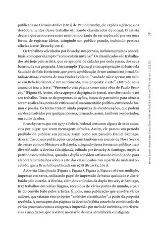 publicada no Circuito Atelier (2011) de Paulo Bruscky, ele explica a gênese e os desdobramentos desse trabalho utilizando classificados de jornal. O artista declara que achou esse meio muito importante de ser explorado por ser uma forma de registrar ideias, atingindo um público grande, incluindo pessoas alheias à arte (Bruscky, 2011). Os trabalhos veiculados por Bruscky, nos jornais, incluíam projetos conceituais, como por exemplo: “como colorir nuvens?” Os classificados são trabalhados até hoje pelo artista, que se apropria de cidades por onde passa, dos seus bairros, da sua geografia. Um exemplo (Figura 5) é sua apropriação do bairro da Saudade de Belo Horizonte, que gerou a publicação de um anúncio no jornal Estado de Minas, em uma de suas vindas à cidade: “Saudade não é apenas um bairro em Belo Horizonte, é um sentimento, uma proposta: é arte”. Outro de seus anúncios traz a frase: ”Vervendo esta página como uma obra de Paulo Bruscky” (Figura 6). Assim, ele se apropria da página do jornal, transformando-a no seu trabalho. Trata-se de propostas de ações, busca de patrocínio para obras a serem realizadas, notas de crítica social ou comentário político, envolvendo humor e poesia. Os textos trazem ainda propostas de eventos/ações, que podem ser desenvolvidos por qualquer pessoa, tornando, assim, também o espectador, um autor da obra. Bruscky narra que em 1977 a Polícia Federal censurou alguns de seus anúncios por julgar que eram mensagens cifradas. Assim, ele passou um período proibido de publicar em jornais, assim como seu parceiro Daniel Santiago. Apesar disso, suas publicações circularam também em jornais de Nova York e de países como o México e a Holanda, atingindo dessa forma um público mais diversificado. A Revista Classificada, editada por Bruscky & Santiago, surgiu a partir desses trabalhos, quando a dupla convidou artistas do mundo todo para elaborarem trabalhos sobre a arte dos classificados. Foi a partir do material recebido, que a Revista foi publicada em 1978 (Bruscky, 2011). A Revista Classificada (Figura 7, Figura 8, Figura 9, Figura 10) é um múltiplo, impresso em xerox, utilizando papel de impressão de baixa qualidade e distribuído pelo correio. A Revista, além dos anúncios da dupla Bruscky & Santiago, traz trabalhos em várias línguas, recebidos de várias partes do mundo, a partir do convite feito pelos artistas. É, pois, uma publicação que envolve vários autores, que criaram seus próprios “anúncios classificados”, a partir da proposta recebida. A montagem das páginas da Revista foi feita através da combinação de vários processos como a colagem, a impressão por meio de carimbos, interferências à mão, xerox, que resultou na criação de uma obra híbrida e instigante.