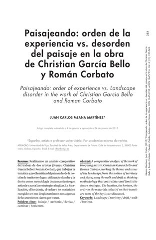 233 Meana Martínez, Juan Carlos (2015) “Paisajeando: orden de la experiencia vs. desorden del paisaje en la obra de Christian García Bello y Román Corbato.” Revista :Estúdio, Artistas sobre Outras Obras. ISSN 1647-6158, e-ISSN 1647-7316. Vol. 6 (11): 233-248.