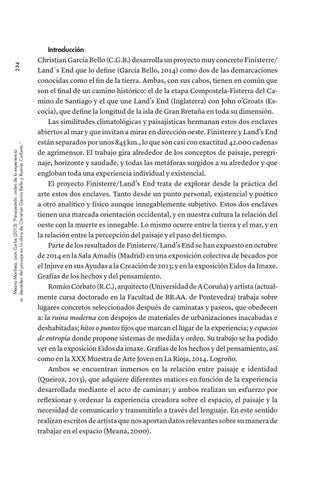 Introducción Christian García Bello (C.G.B.) desarrolla un proyecto muy concreto Finisterre/ Land´s End que lo define (García Bello, 2014) como dos de las demarcaciones conocidas como el fin de la tierra. Ambas, con sus cabos, tienen en común que son el final de un camino histórico: el de la etapa Compostela-Fisterra del Camino de Santiago y el que une Land’s End (Inglaterra) con John o’Groats (Escocia), que define la longitud de la isla de Gran Bretaña en toda su dimensión. Las similitudes climatológicas y paisajísticas hermanan estos dos enclaves abiertos al mar y que invitan a mirar en dirección oeste. Finisterre y Land’s End están separados por unos 845 km., lo que son casi con exactitud 42.000 cadenas de agrimensor. El trabajo gira alrededor de los conceptos de paisaje, peregrinaje, horizonte y saudade, y todas las metáforas surgidos a su alrededor y que engloban toda una experiencia individual y existencial. El proyecto Finisterre/Land’s End trata de explorar desde la práctica del arte estos dos enclaves. Tanto desde un punto personal, existencial y poético a otro analítico y físico aunque innegablemente subjetivo. Estos dos enclaves tienen una marcada orientación occidental, y en nuestra cultura la relación del oeste con la muerte es innegable. Lo mismo ocurre entre la tierra y el mar, y en la relación entre la percepción del paisaje y el paso del tiempo. Parte de los resultados de Finisterre/Land’s End se han expuesto en octubre de 2014 en la Sala Amadís (Madrid) en una exposición colectiva de becados por el Injuve en sus Ayudas a la Creación de 2013; y en la exposición Eidos da Imaxe. Grafías de los hechos y del pensamiento. Román Corbato (R.C.), arquitecto (Universidad de A Coruña) y artista (actualmente cursa doctorado en la Facultad de BB.AA. de Pontevedra) trabaja sobre lugares concretos seleccionados después de caminatas y paseos, que obedecen a: la ruina moderna con despojos de materiales de urbanizaciones inacabadas e deshabitadas; hitos o puntos fijos que marcan el lugar de la experiencia; y espacios de entropía donde propone sistemas de medida y orden. Su trabajo se ha podido ver en la exposición Eidos da imaxe. Grafías de los hechos y del pensamiento, así como en la XXX Muestra de Arte Joven en La Rioja, 2014. Logroño. Ambos se encuentran inmersos en la relación entre paisaje e identidad (Queiroz, 2013), que adquiere diferentes matices en función de la experiencia desarrollada mediante el acto de caminar; y ambos realizan un esfuerzo por reflexionar y ordenar la experiencia creadora sobre el espacio, el paisaje y la necesidad de comunicarlo y transmitirlo a través del lenguaje. En este sentido realizan escritos de artista que nos aportan datos relevantes sobre su manera de trabajar en el espacio (Meana, 2000).