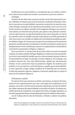Establecemos tres ejes temáticos y conceptuales que nos ayudan a relacionar la obra de estos artistas de acuerdo a sus intereses y procesos creativos: a) Refugio Partimos de dos obras muy concretas nacidas con la clara intención de acotar y delimitar un espacio que actúa de elemento catalizador del paisaje. Sintetiza y concentra en su materialidad y operación constructiva los aspectos esenciales del lugar caminado, de la experiencia desarrollada. En el caso de C.G.B. la obra muestra con objetos extraídos de la imaginería del lugar, una construcción mínima, de intención aún precaria, que apunta a una primaria construcción de supervivencia: un trípode formado por dos remos apoyados en uno de sus extremos sobre un cuchillo colocado verticalmente con el filo apuntando al cielo. Dos remos y un cuchillo nos hablan de la actividad desarrollada por quienes habitan el lugar, de la dureza por la supervivencia donde usar herramientas punzantes es haber ganado a la naturaleza y donde los elementos usados para el desplazamiento sirvan también para marcar un emplazamiento siendo pilares constructivos momentáneos (Figura 1 y Figura 2). En el caso de R.C. la construcción de un metro cúbico con resto de material cerámico de azulejo extraído del lugar elegido por su interés de ruina posmoderna, le sirve como unidad de medida, que no es sino un intento de poner orden en la inmensidad de un lugar de entropía creciente (Figura 3). Sin embargo, esta escultura muestra dos caras bien diferenciadas, aquella que efectivamente obedece al acto constructivo bajo los parámetros elegidos de medición; pero también, en su cara interna y vacía del interior, a aquello que no pretendiéndolo, hace aparición, el lugar refugio, metáfora de lo habitable que nos muestra su lado más punzante, agresivo, orgánico e irracional, aquello que se escapa en todo acto de medición (Figura 4). b) Horizonte y umbral Se trata de obras que muestran un límite, una juntura, el espacio del entre, sutura de dos comportamientos que sirve como lugar de la experiencia con el paisaje y con la obra. Se diseccionan elementos del paisaje con el fin de simbolizar y dejar constancia del espacio habitado y recorrido en la deriva. Se extraen materiales que han de reordenarse en el espacio de la obra, en el lugar expositivo, en una clara apropiación del par conceptual propuesto por R. Smithson site/nonsite. C.G.B. Trabaja sobre la idea de horizonte y el límite o umbral. En palabras del artista: Inicio mi investigación en un lugar concreto: la carretera PO-552 en el tramo que une Baiona y Camposancos. Esta carretera, de marcada orientación Norte-Sur, camina