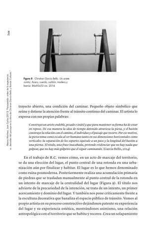 trayecto abierto, una condición del caminar. Pequeño objeto simbólico que reúne y detiene la atención frente al tránsito continuo del caminar. El artista lo expresa con sus propias palabras: Construyo un ariete endeble, pesado e inútil y que para mantener su forma ha de estar en reposo. De esa manera la idea de tiempo detenido atraviesa la pieza, y el bastón construye la relación con el camino, el individuo y el paisaje que recorre. Por ese motivo, la pieza toma como escala al ser humano tanto en sus dimensiones horizontales como verticales: la separación de los soportes equivale a un paso y la longitud del bastón a una pierna. El titulo, una frase inacabada, pretende evidenciar que no hay nada que golpear, que no hay más golpeteo que el seguir caminando. (García Bello, 2014)