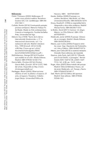 Referencias Careri, Francesco (2002) Walkscapes: El andar como práctica estética. Barcelona: Gustavo Gili, Col. Land&Scape. ISBN 84252-1841-1 Corbato, Román (2014) Construyendo paisajes: procesos entrópicos. Memoria Trabajo Fin de Master. Master en Arte contemporáneo. Creación e Investigación, Facultad de Bellas Artes, Universidad de Vigo. Debord, Guy (1958) “Teoría de la deriva: Internationale Situationniste, n. 2” In Internacional situacionista, vol. I: La realización del arte. Madrid: Literatura Gris, 1999 [Consult. 2014-12-28]. <URL:http://www.ugr.es/~silvia/ documentos%20colgados/IDEA/ teoria%20de%20la%20deriva.pdf > Didi-Huberman, George (2014) El hombre que andaba en el color. Abada Editores. Madrid. ISBN 978-84-16160-17-4 García Bello, Christian (2014) Christian García Bello. [Consult. 2014-12-27]. Web del artista. Disponible en http://www. christiangarciabello.es/ Heidegger, Martin (2003) Observaciones relativas al arte: la plástica: el espacio: El arte y el espacio. Pamplona: Cátedra Jorge Oteiza. Universidad Pública de