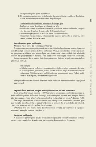 Procedimentos para publicação Primeira fase: envio de resumos provisórios Para submeter um resumo preliminar do seu artigo à Revista Estúdio envie um e-mail para estudio@fba.ul.pt, com dois anexos distintos em formato Word, e assinalando o número da revista em que pretende publicar, mas sem qualquer menção ao autor, direta ou deduzível (eliminá-la também das propriedades do ficheiro). Não pode haver auto-citação na fase de submissão. Ambos os anexos têm o mesmo título (uma palavra do título do artigo) com uma declinação em _a e em _b. Por exemplo: · o ficheiro palavra_preliminar_a.docx contém o título do artigo e os dados do autor. · o ficheiro palavra_preliminar_b.docx contém título do artigo e um resumo com um máximo de 2.000 caracteres ou 300 palavras, sem nome do autor. Poderá incluir uma ou duas figuras, devidamente legendadas. Estes procedimentos em ficheiros diferentes visam viabilizar a revisão científica cega (blind peer review). Segunda fase: envio de artigos após aprovação do resumo provisório Cada artigo final tem um máximo 11.000 caracteres sem espaços, excluindo resumos e referências bibliográficas. O formato do artigo, com as margens, tipos de letra e regras de citação, deve seguir o ‘meta-artigo’ auto exemplificativo (meta-artigo em versão *.docx ou *.rtf ). Este artigo é enviado em ficheiro contendo todo o artigo (com ou seu título), mas sem qualquer menção ao autor, direta ou deduzível (eliminá-la também das propriedades do ficheiro). Não pode haver auto-citação na fase de submissão. O ficheiro deve ter o mesmo nome do anteriormente enviado, acrescentando a expressão ‘completo’ (exemplo: palavra_completo_b). Custos de publicação A publicação por artigo na Estúdio pressupõe uma pequena comparticipação de cada autor nos custos associados. A cada autor são enviados dois exemplares da revista.