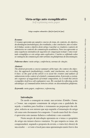 Resumo: O resumo apresenta um sumário conciso do tema, do contexto, do objetivo, da abordagem (metodologia), dos resultados, e das conclusões, não excedendo 6 linhas: assim o objetivo deste artigo é auxiliar os criadores e autores de submissões no contexto da comunicação académica. Para isso apresenta-se uma sequência sistemática de sugestões de composição textual. Como resultado exemplifica-se este artigo auto-explicativo. Conclui-se refletindo sobre as vantagens da comunicação entre artistas em plataformas de disseminação. Palavras-chave: meta-artigo, conferência, normas de citação. Abstract: The abstract presents a concise summary of the topic, the context, the objective, the approach (methodology), results, and conclusions, not exceeding 6 lines: so the goal of this article is to assist the creators and authors of submissions in the context of scholarly communication. It presents a systematic sequence of suggestions of textual composition. As a result this article exemplifies itself in a self-explanatory way. We conclude by reflecting on the advantages of communication between artists on dissemination platforms. Keywords: meta-paper, conference, referencing.
